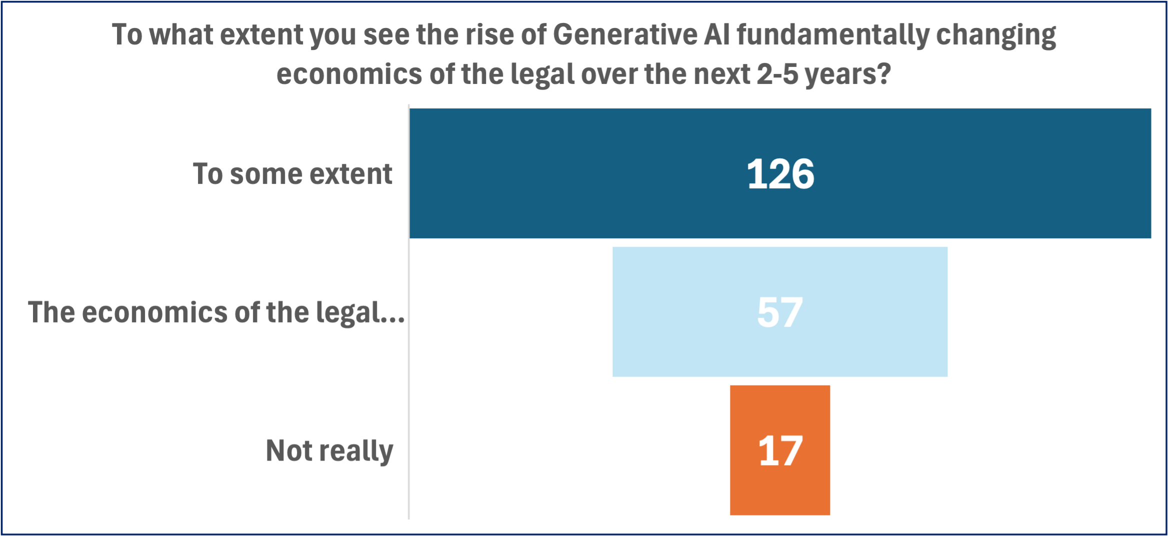 In another poll taken during the event, 29 percent of participants indicated that they believe the economics of the legal ecosystem will look completely different in the next two-to-five years, while 63 percent said it will look different to some extent, and nine percent said it will “not really” look different.